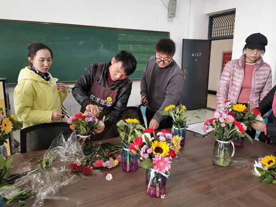 随后,在温馨愉悦的氛围中,老师们现学现用,在花店老师的悉心指导下,凭借每个人对美的不同理解,把原本普通的花草,经过修剪、层次搭配、点缀等步骤,变成了色彩斑斓、独具匠心的花艺作品。