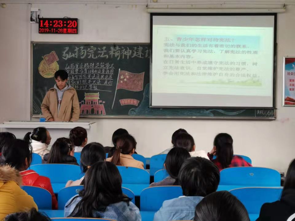 为了增强同学们对宪法知识的了解,提高员工综合素质,建设法治校园,伟德国际bevictor1949于11月28日下午2点在1号教学楼举办了以“弘扬宪法精神,建设法治校园”为主题的团日活动。