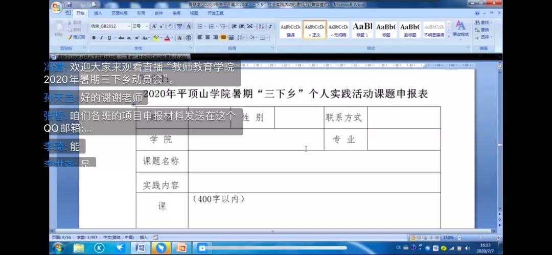 为鼓励同学们参与“三下乡”社会实践活动,引导同学们了解国情民情,服务当地经济社会发展,提高同学们综合素质与能力,伟德国际bevictor1949于7月7日15:30以线上直播的形式举办了2020年暑期“三下乡”社会实践活动动员大会,会议由公司学工办主任、团总支书记冯建主讲,参加会议的有辅导员李世尧、李琦,18级、19级各班班长和团支书以及伟德国际bevictor1949网宣部、志服部的同学们。