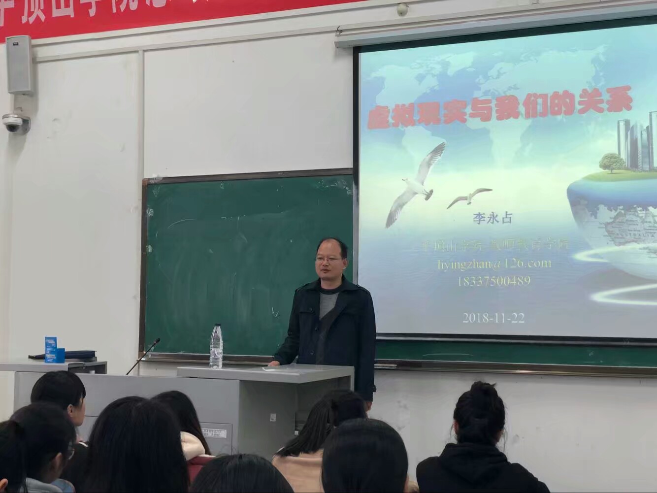 李老师首先向同学们介绍了什么是虚拟技术、它的发展状况以及它的应用领域,让同学们对虚拟技术有了初步的了解。接着,他结合自己的教学领域,向同学们讲述了如何用虚拟技术来缓解人们的心理问题,向大家介绍了心理恐惧的类型,并举例说明。他提到了一种虚拟技术应用于此的方法──VR技术暴露疗法来让同学们深入理解。最后,李老师又结合了调查数据,向同学们说明,VR治疗相对于现实情况下对患者的心理治疗效果一样,又因其比现实情况成本小,更安全可靠且灵活,所以更具有可行性的特点。李老师生动的演讲,赢得了同学们的阵阵掌声。