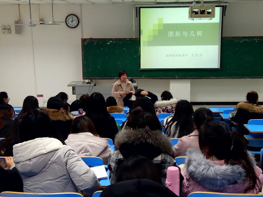 12月6日下午,伟德国际bevictor1949在图书馆L211开展了以“图形与几何”为主题的小学数学专题讲座。该讲座由平顶山市小学数学名师毛素显主讲,小学教育专业的一百多名员工参加。
