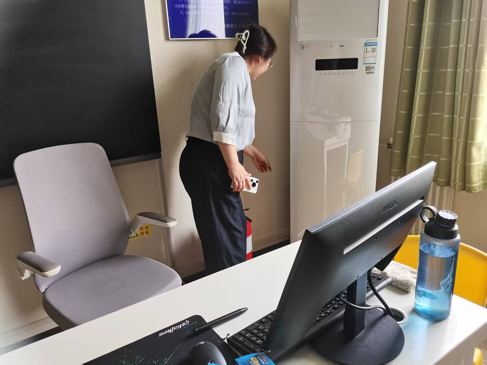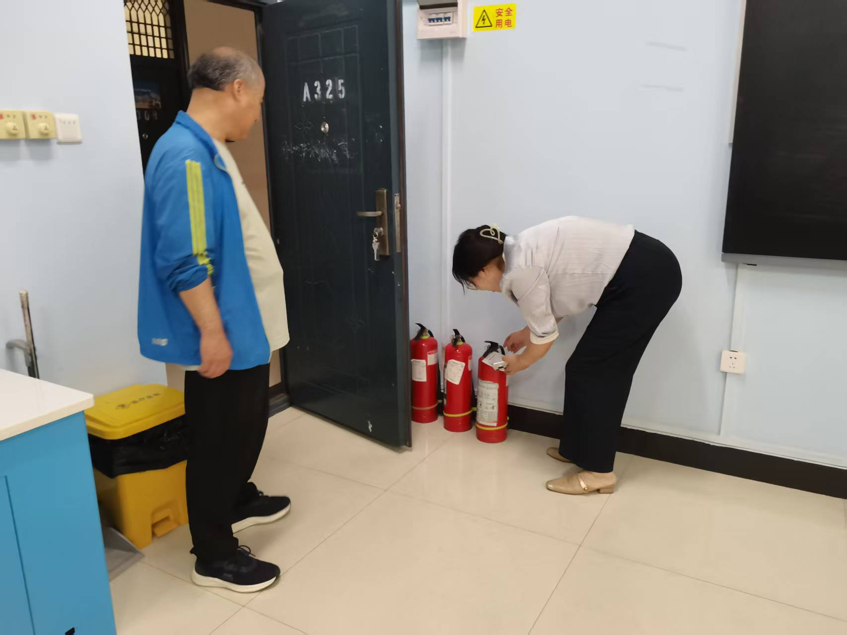 此次检查在主要针对实验室插座、灭火器、门窗、违规使用电热设备及长期运行设备管理不规范等安全隐患问题门后杂物等进行了细致检查。